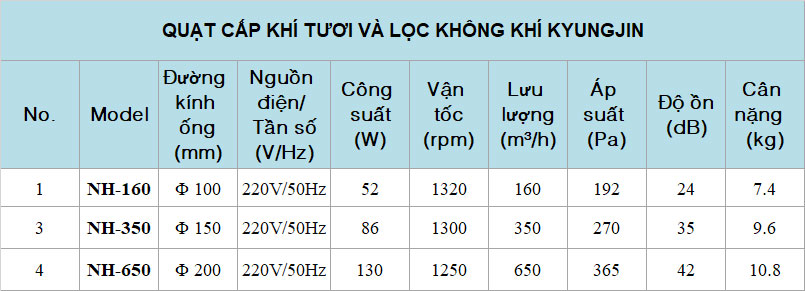 | Tên sản phẩm | Quạt cấp khí tươi và lọc không khí Kyungjin NH-160 |