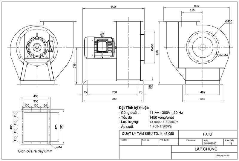 Tải bản vẽ lắp đặt Quạt ly tâm hút bếp HAIKI HK71-050-11