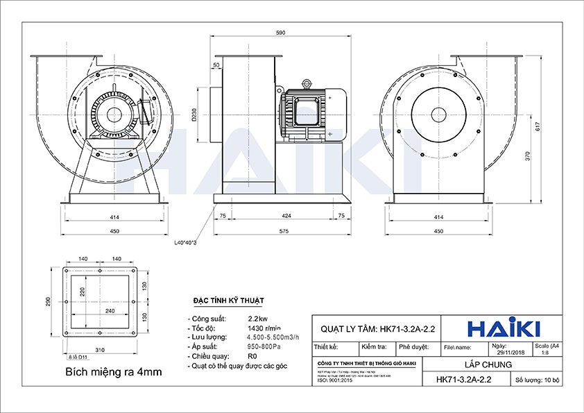 Tải bản vẽ lắp đặt Quạt ly tâm hút bếp HAIKI HK71-3.2A-2.2