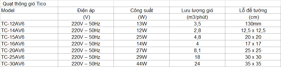 | Tên sản phẩm | Quạt thông gió gắn tường Tico TC-12AV6 |