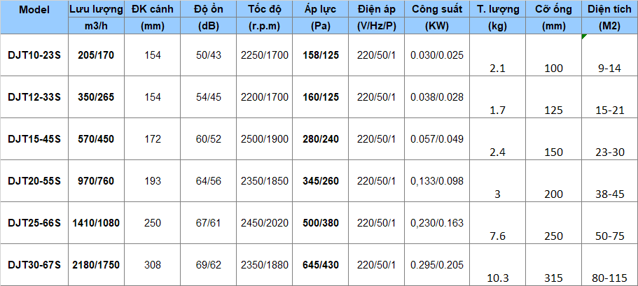THÔNG SỐ KÝ THUẬT CÁC MODEL QUẠT THÔNG GIÓ ÂM TRẦN NỐI ỐNG NEDFON DJT