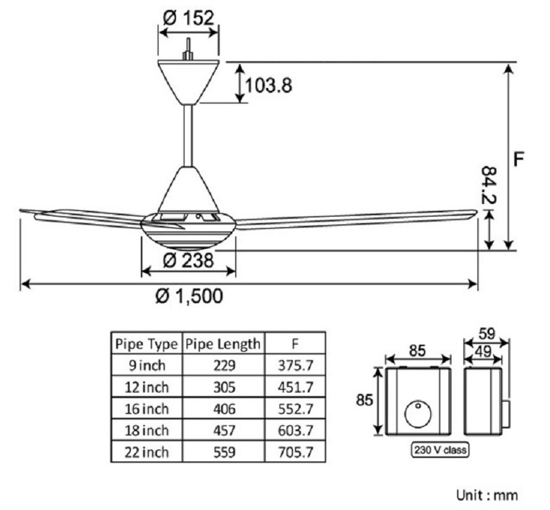 Bản vẽ kích thước lắp đặt Quạt trần Panasonic F-60MZ2-KS 3 cánh màu đen